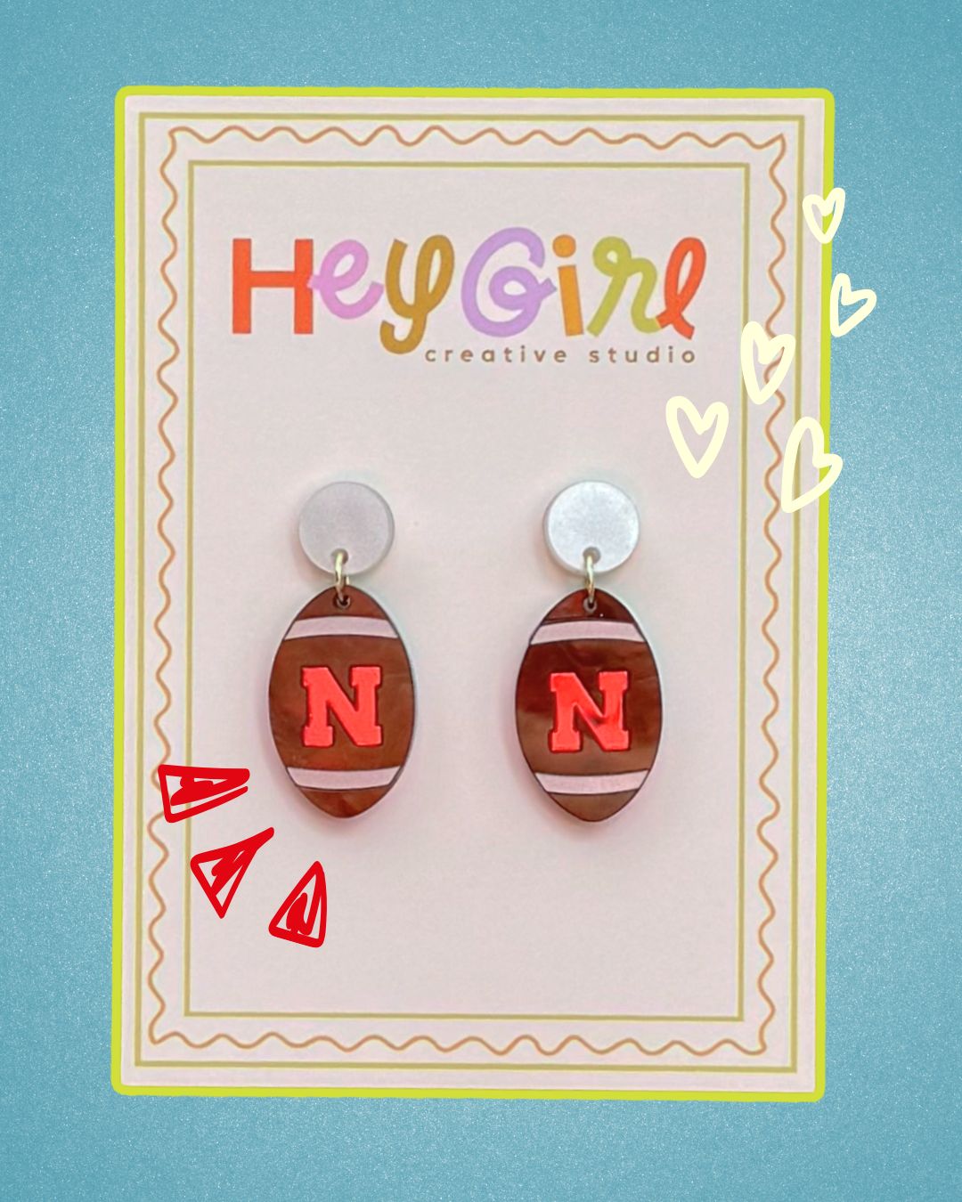 Husker football fans, these are for you! Hand-designed and assembled right here in the studio, these statement earrings feature bold acrylic colors with the iconic Nebraska “N” in red mirror acrylic set on a football — perfect for showing your team spirit in style. Lightweight, vibrant, and ready to cheer on the Big Red! 🌽❤️