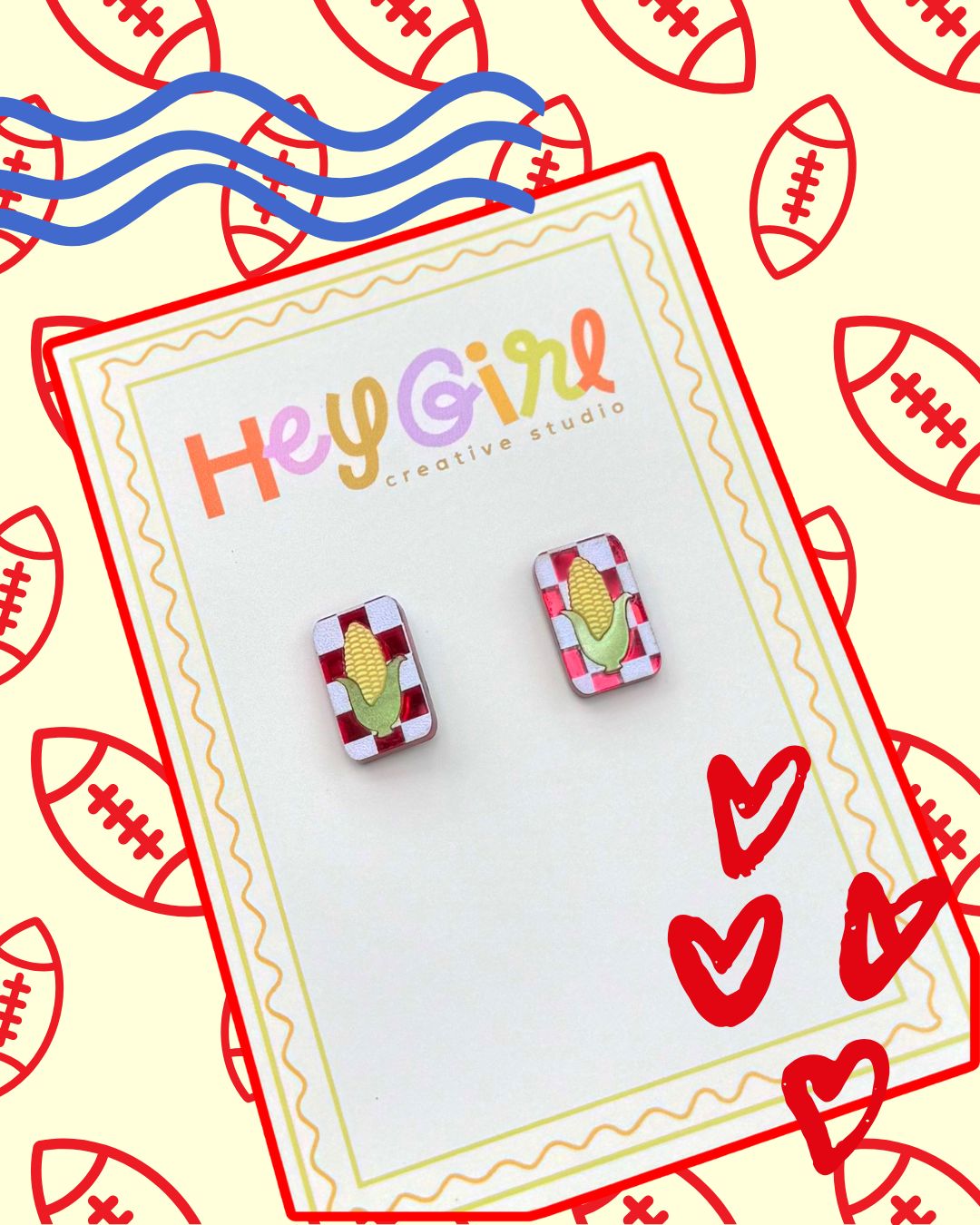 Small but mighty! These adorable acrylic stud earrings showcase a sweet ear of corn framed by classic Nebraska red-and-white checks. Perfect for adding a pop of Husker spirit to any outfit, whether you’re tailgating, hitting the game, or just showing your Cornhusker pride on the daily!