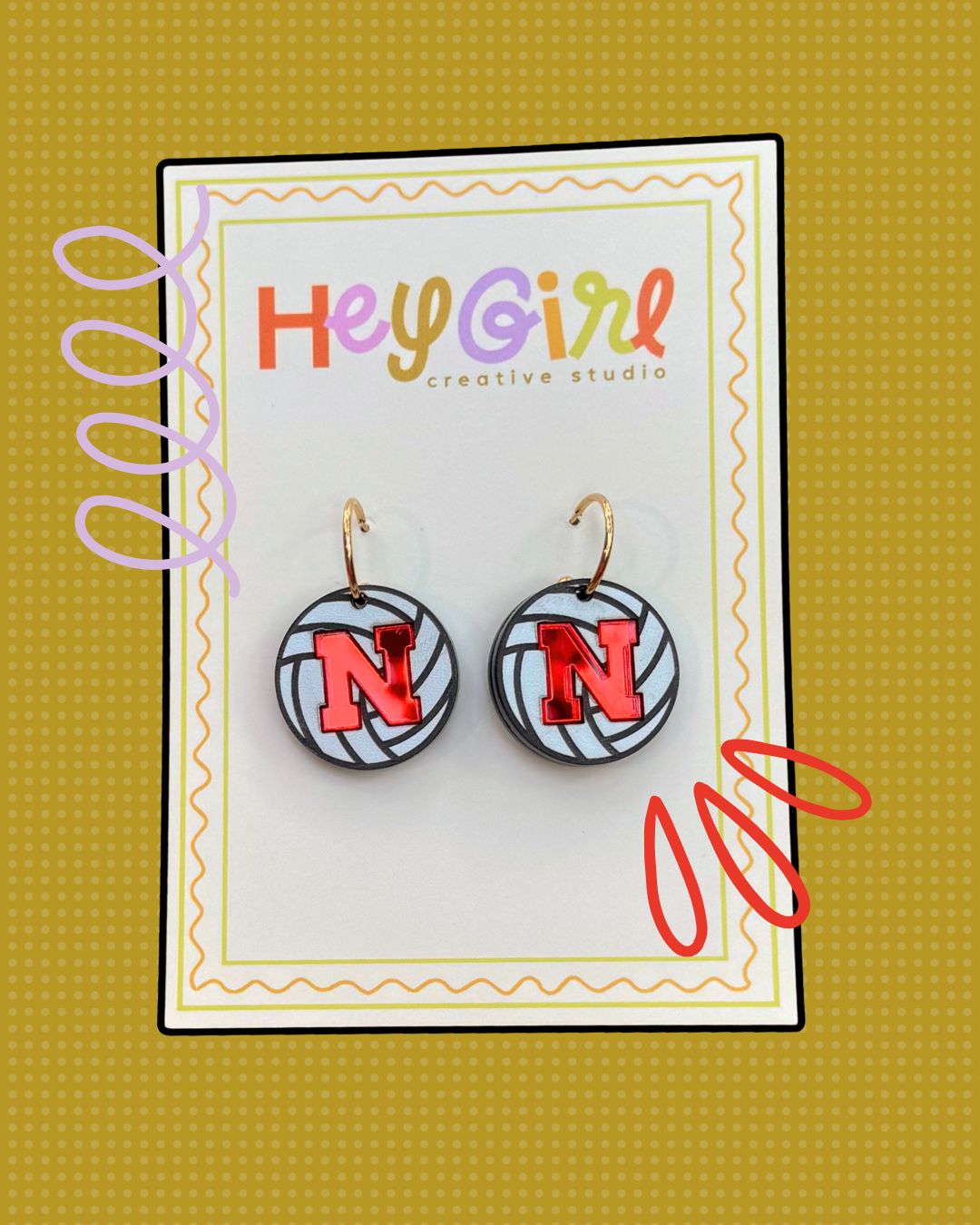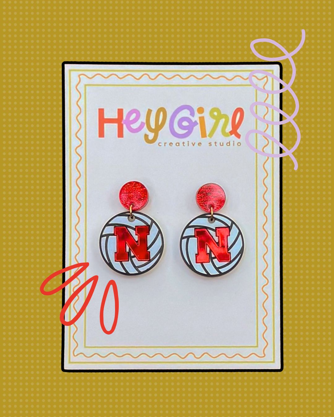 Volleyball Husker fans, these are for you! Hand-designed and assembled right here in the studio, these statement earrings feature bold acrylic colors with the iconic Nebraska “N” set on a volleyball background — perfect for showing your team spirit in style. Lightweight, vibrant, and ready to cheer on the Big Red! 🌽❤️